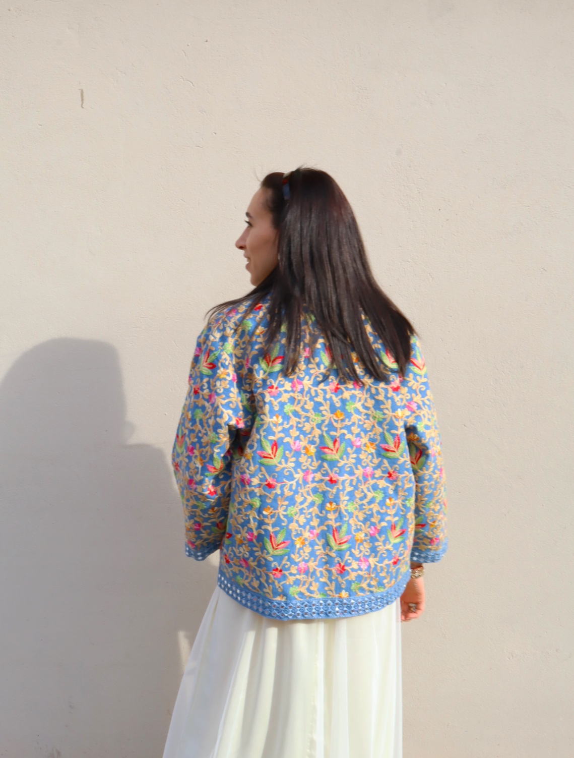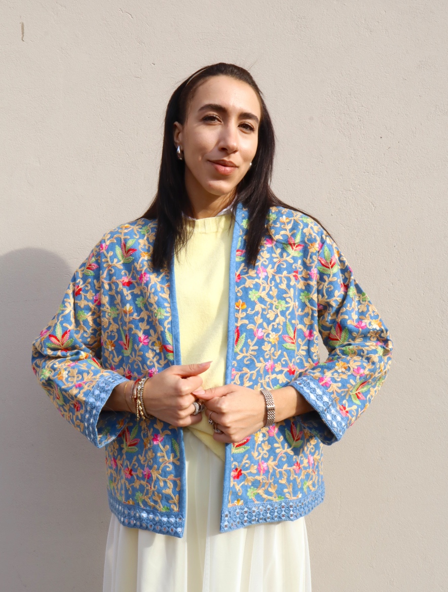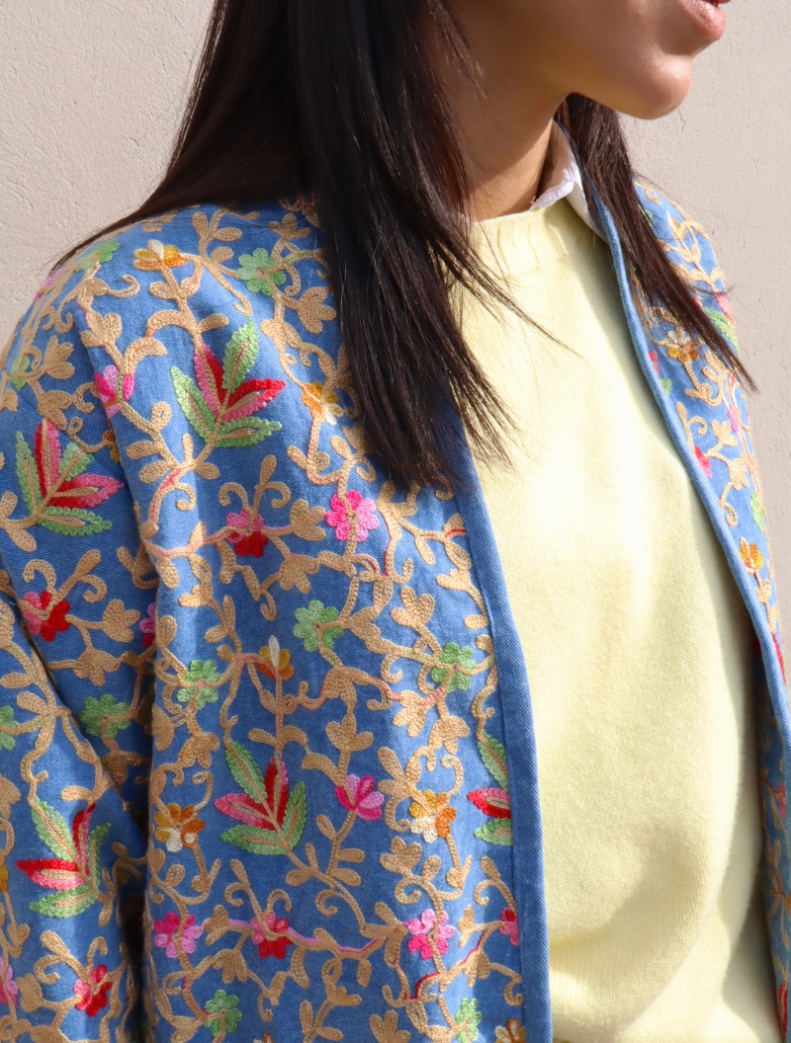 Il design aperto e la linea morbida e leggermente boxy rendono il capo comodo e facile da abbinare, mentre i ricami e i dettagli sul fondo e sui polsini aggiungono un tocco artigianale e raffinato.