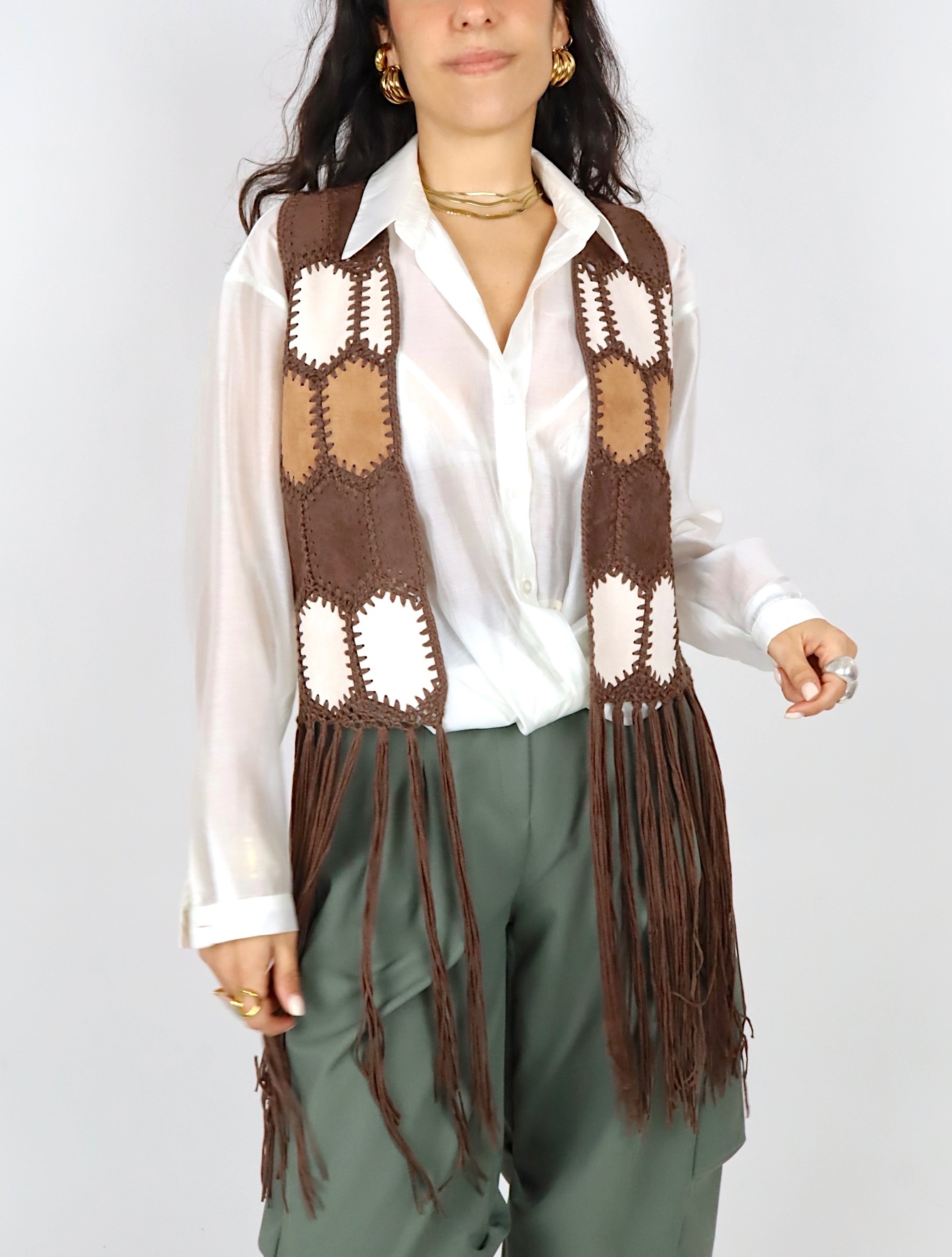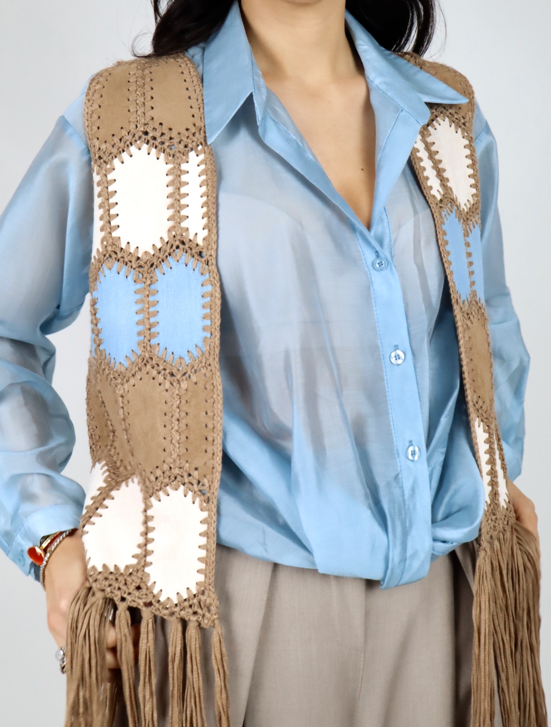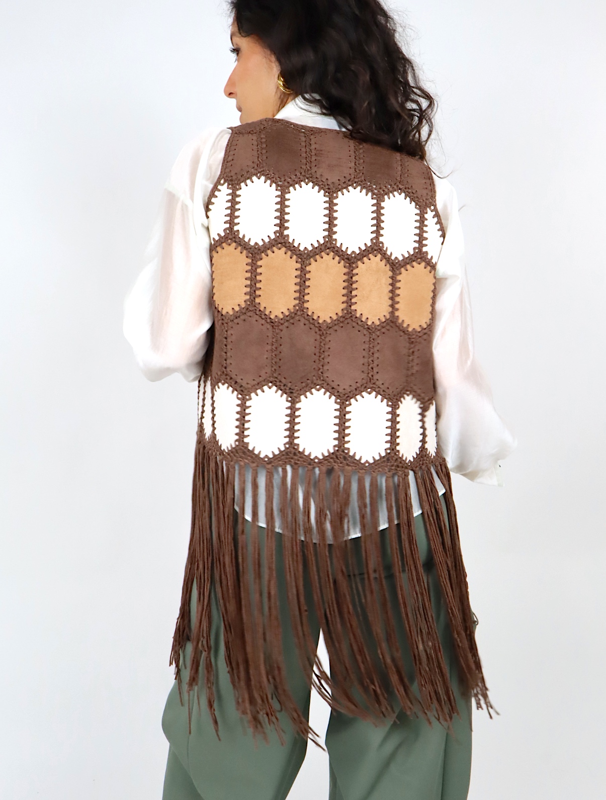 Gilet dallo stile boho e ricercato, perfetto per arricchire anche i look più semplici. Realizzato in tessuto effetto suede, è decorato con inserti lavorati a contrasto che creano un motivo grafico dal sapore artigianale.