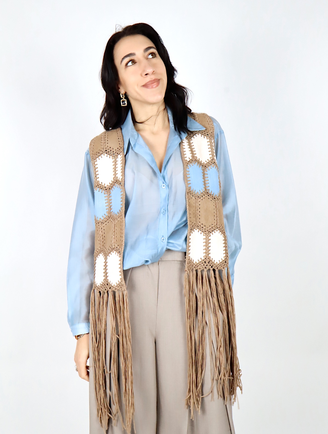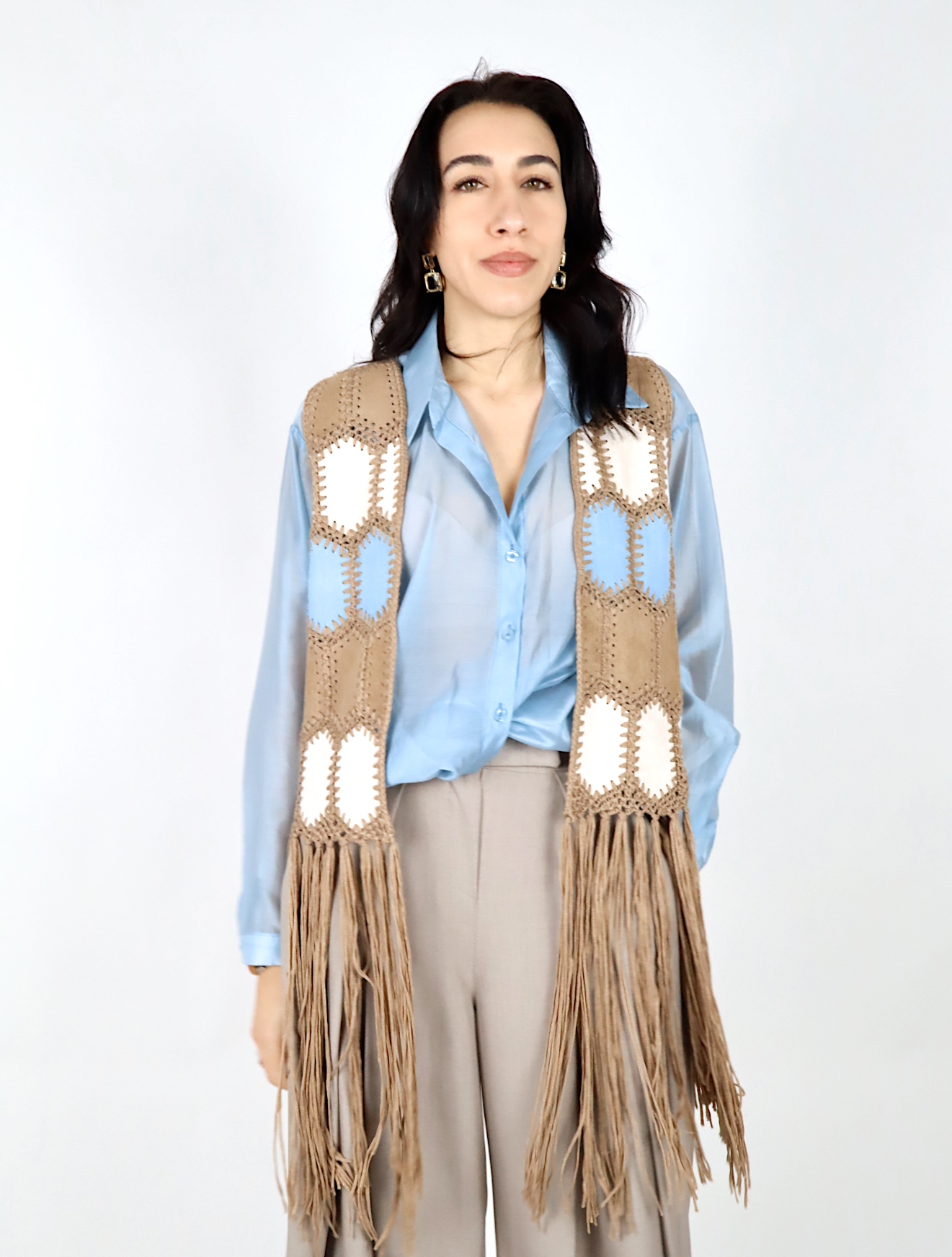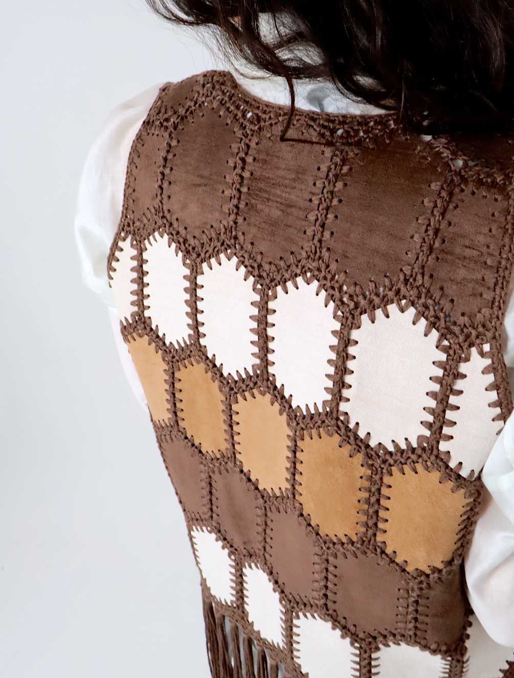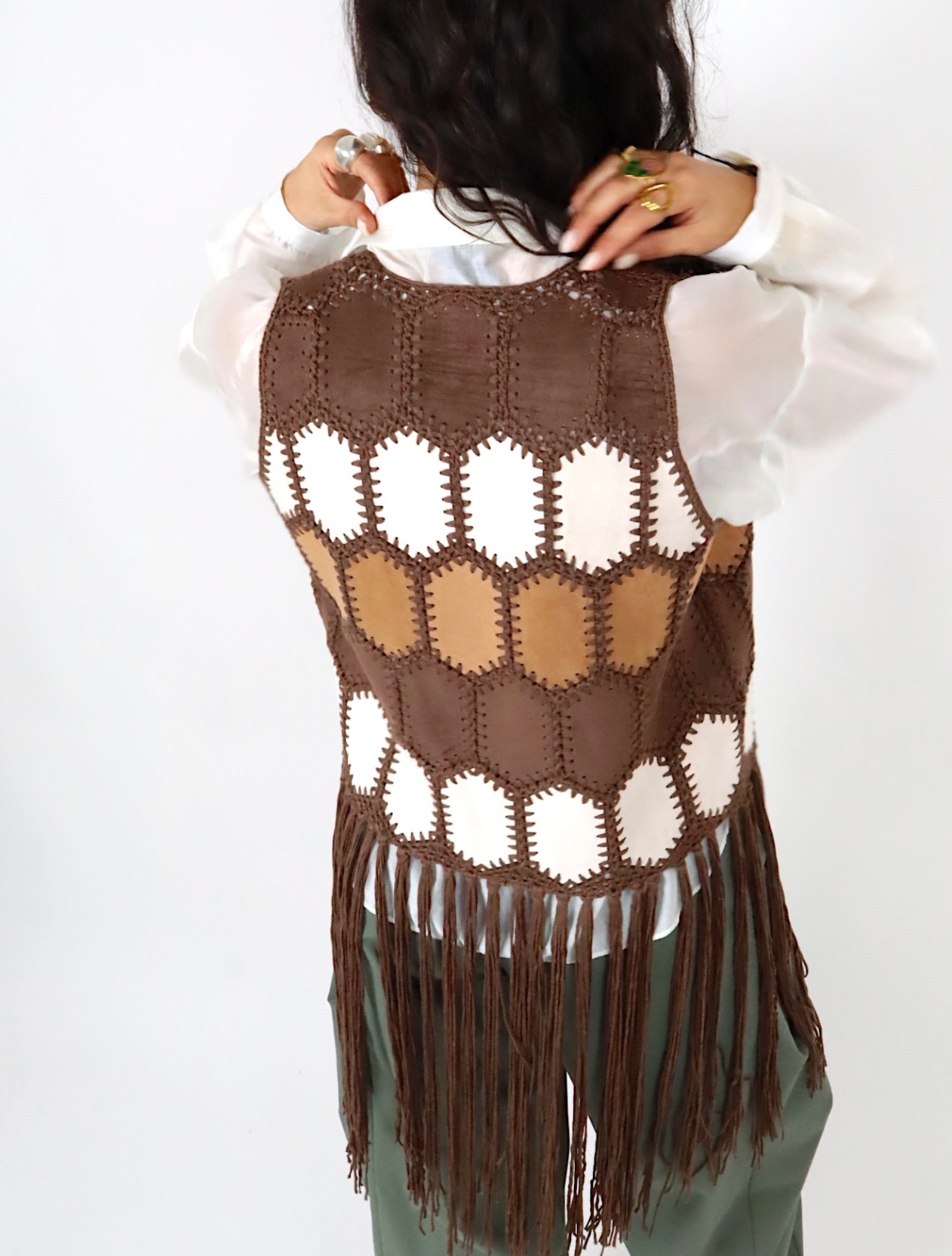 Gilet dallo stile boho e ricercato, perfetto per arricchire anche i look più semplici. Realizzato in tessuto effetto suede, è decorato con inserti lavorati a contrasto che creano un motivo grafico dal sapore artigianale.