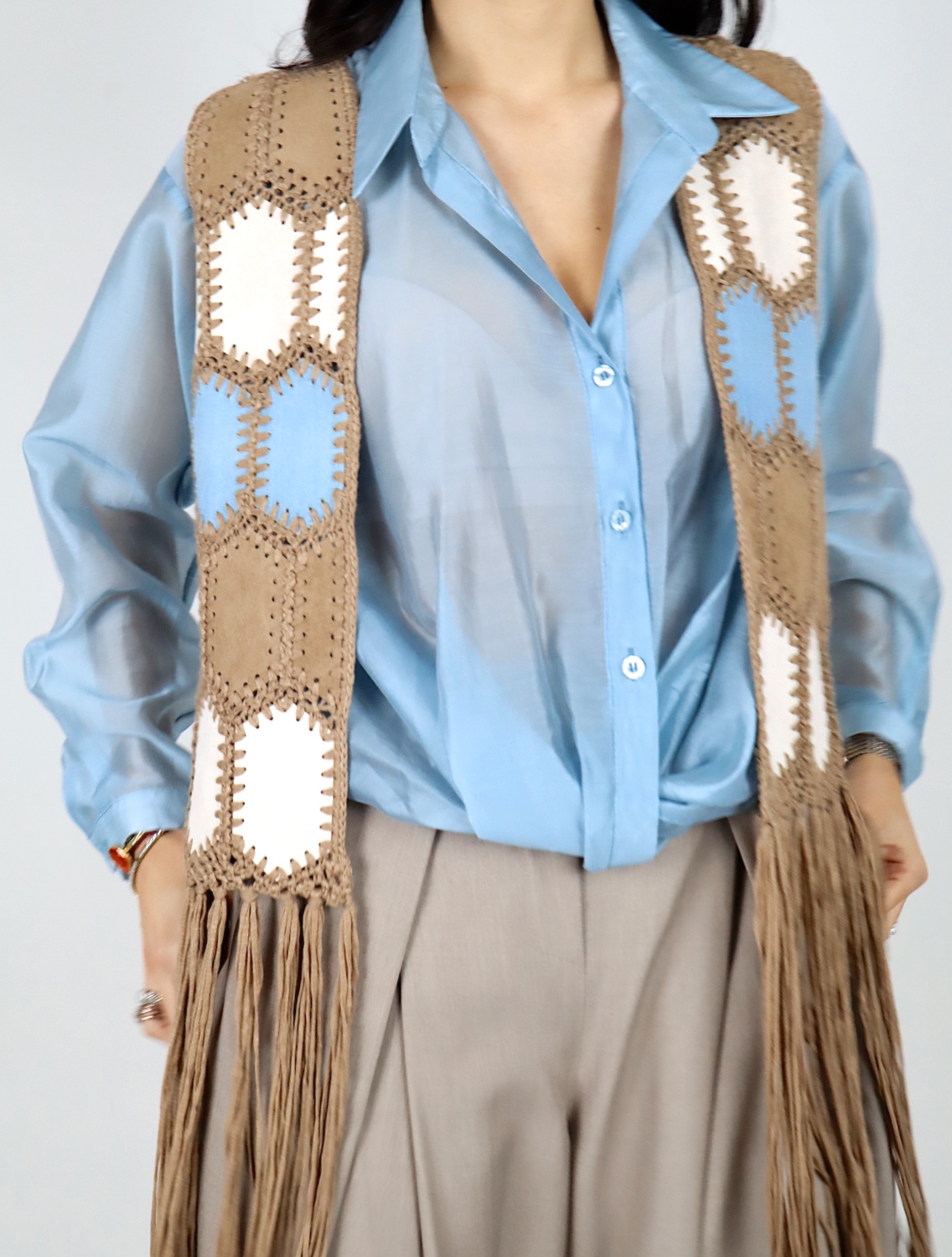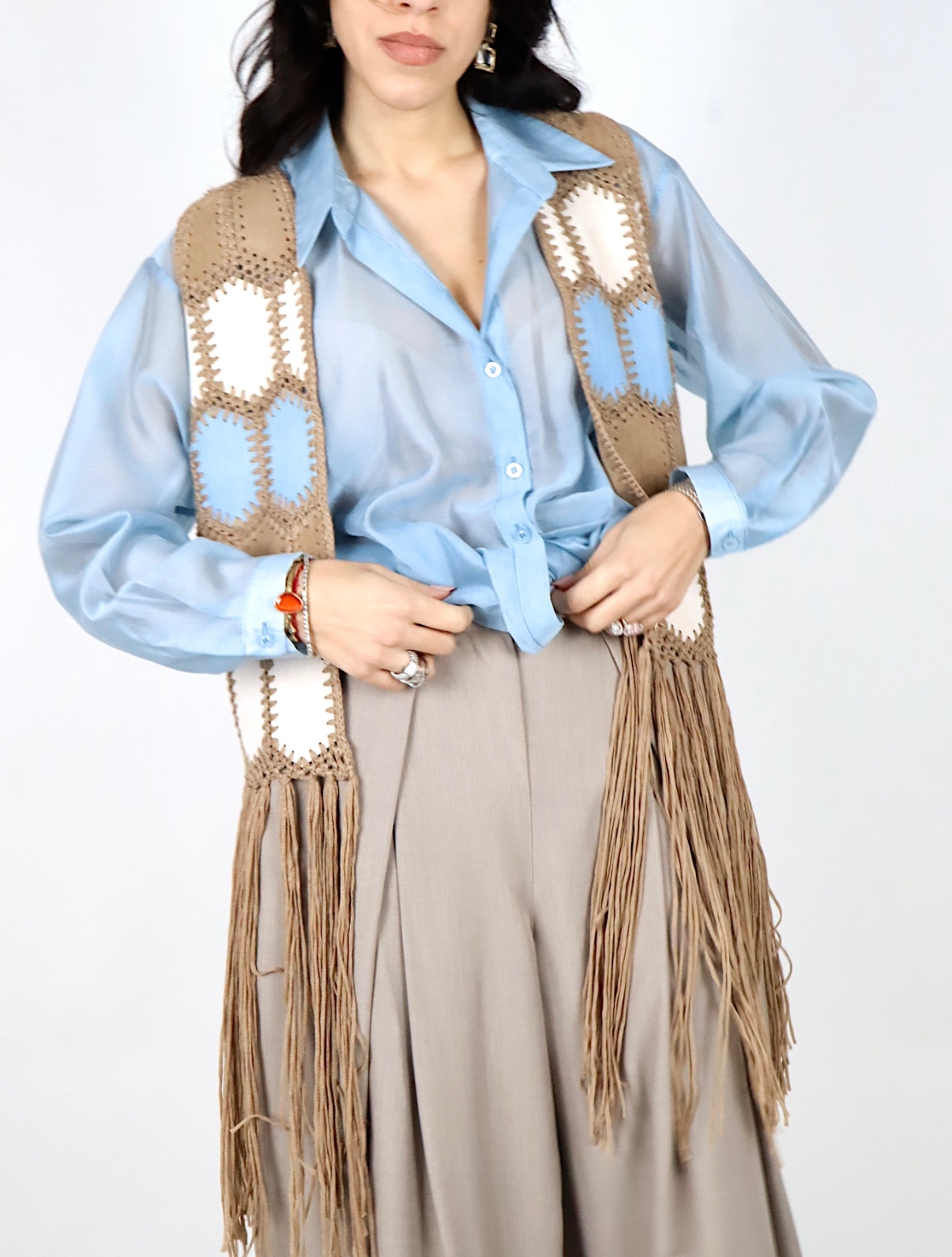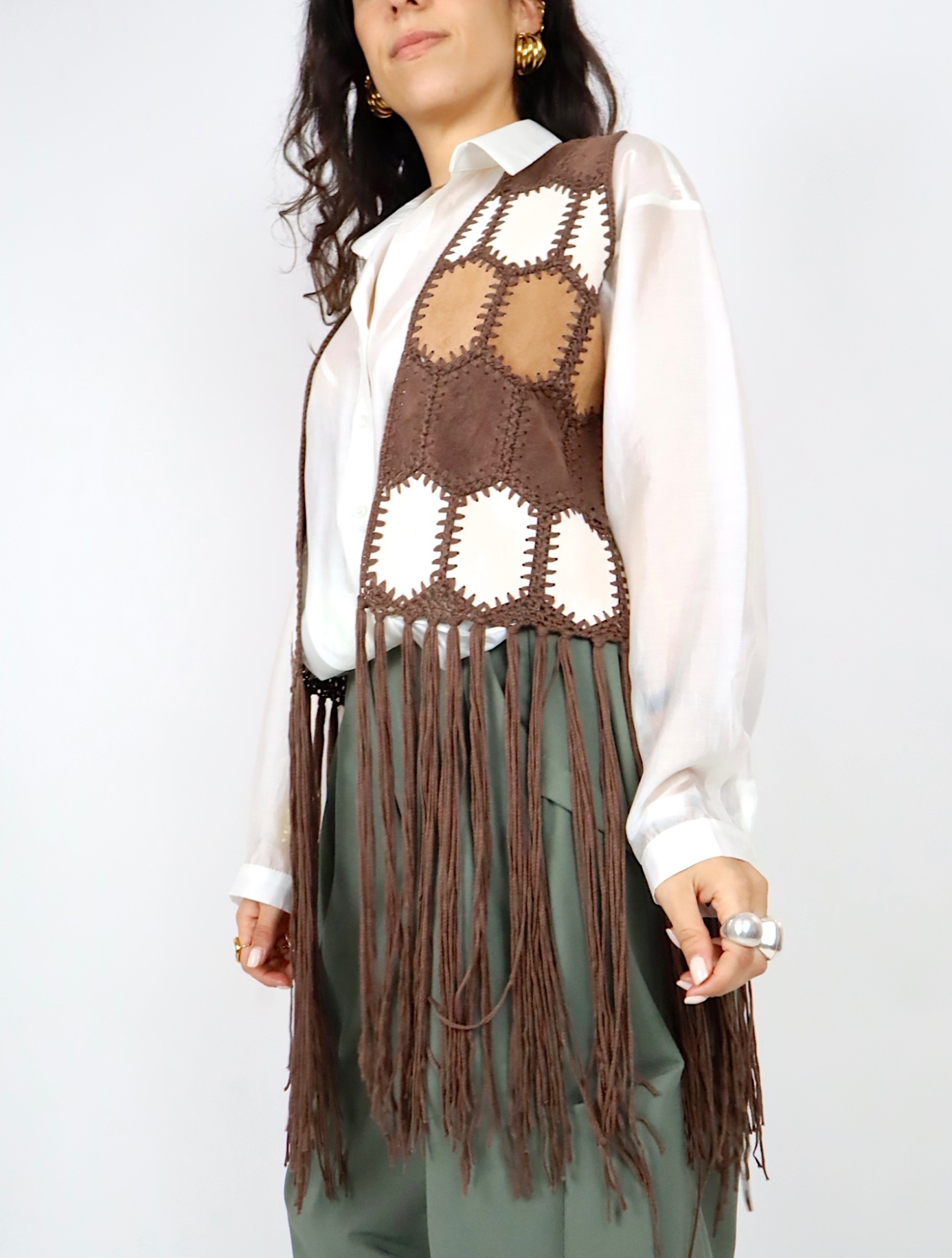 Il design aperto e la linea lunga con frange sul fondo donano movimento al capo e aggiungono un tocco deciso e originale all’outfit.