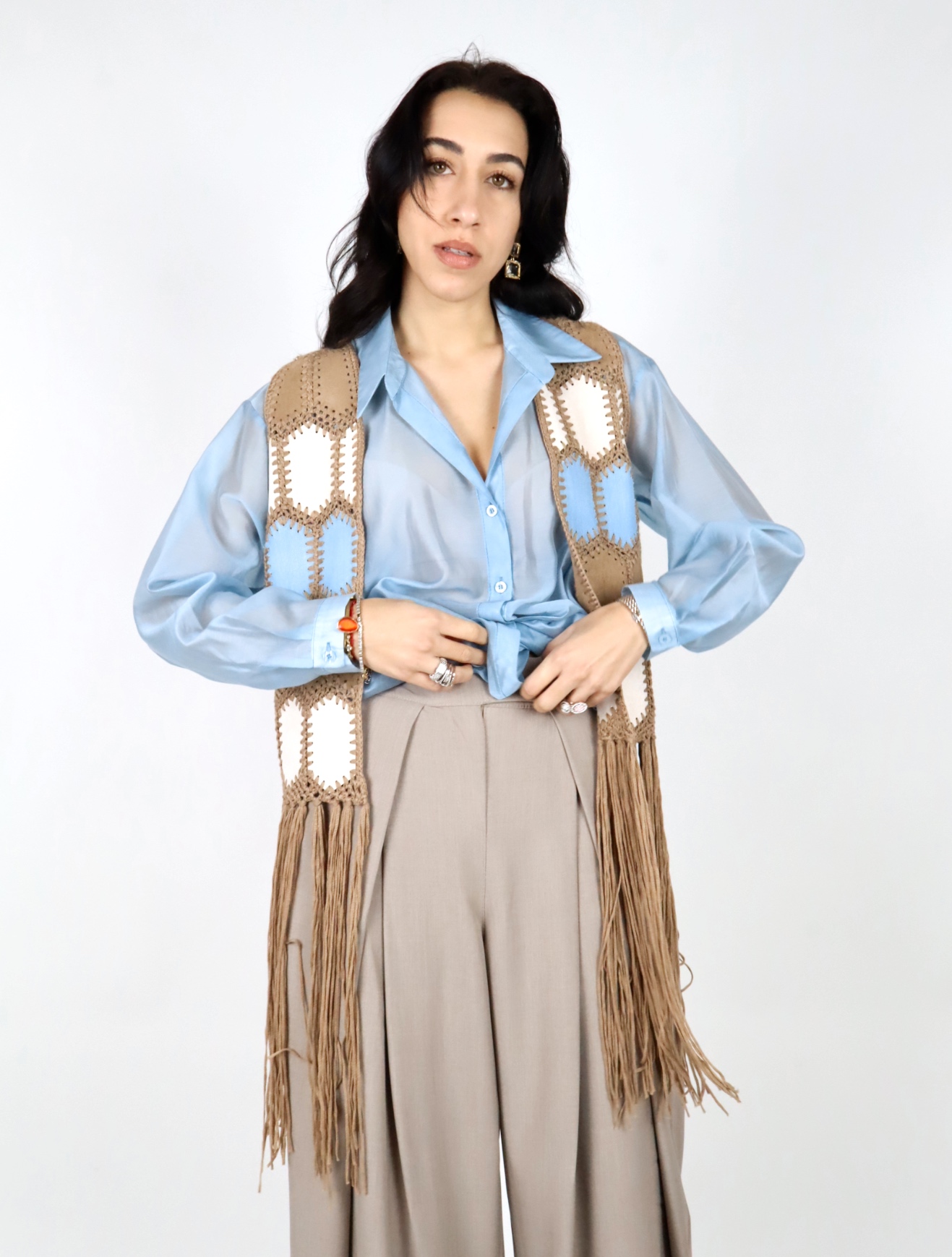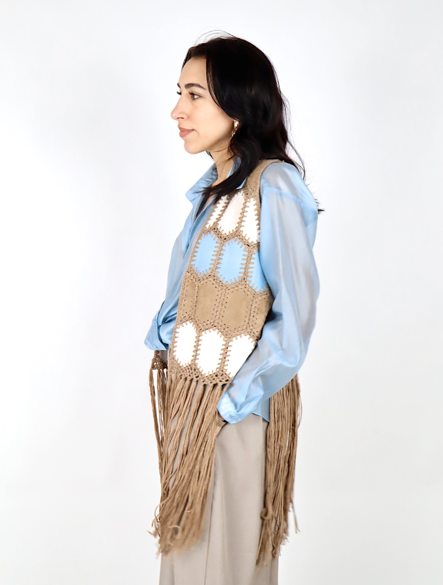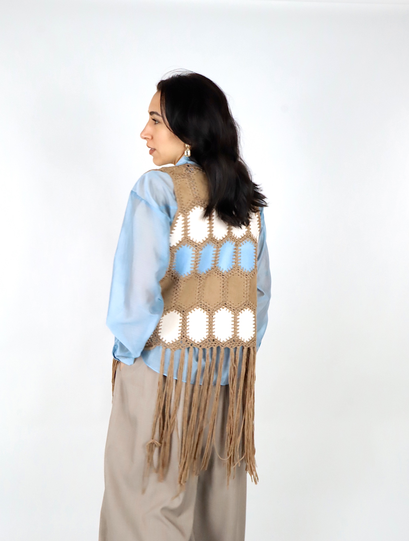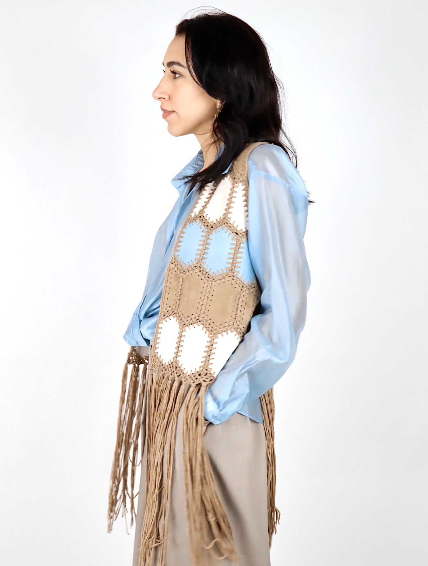 Il design aperto e la linea lunga con frange sul fondo donano movimento al capo e aggiungono un tocco deciso e originale all’outfit.
