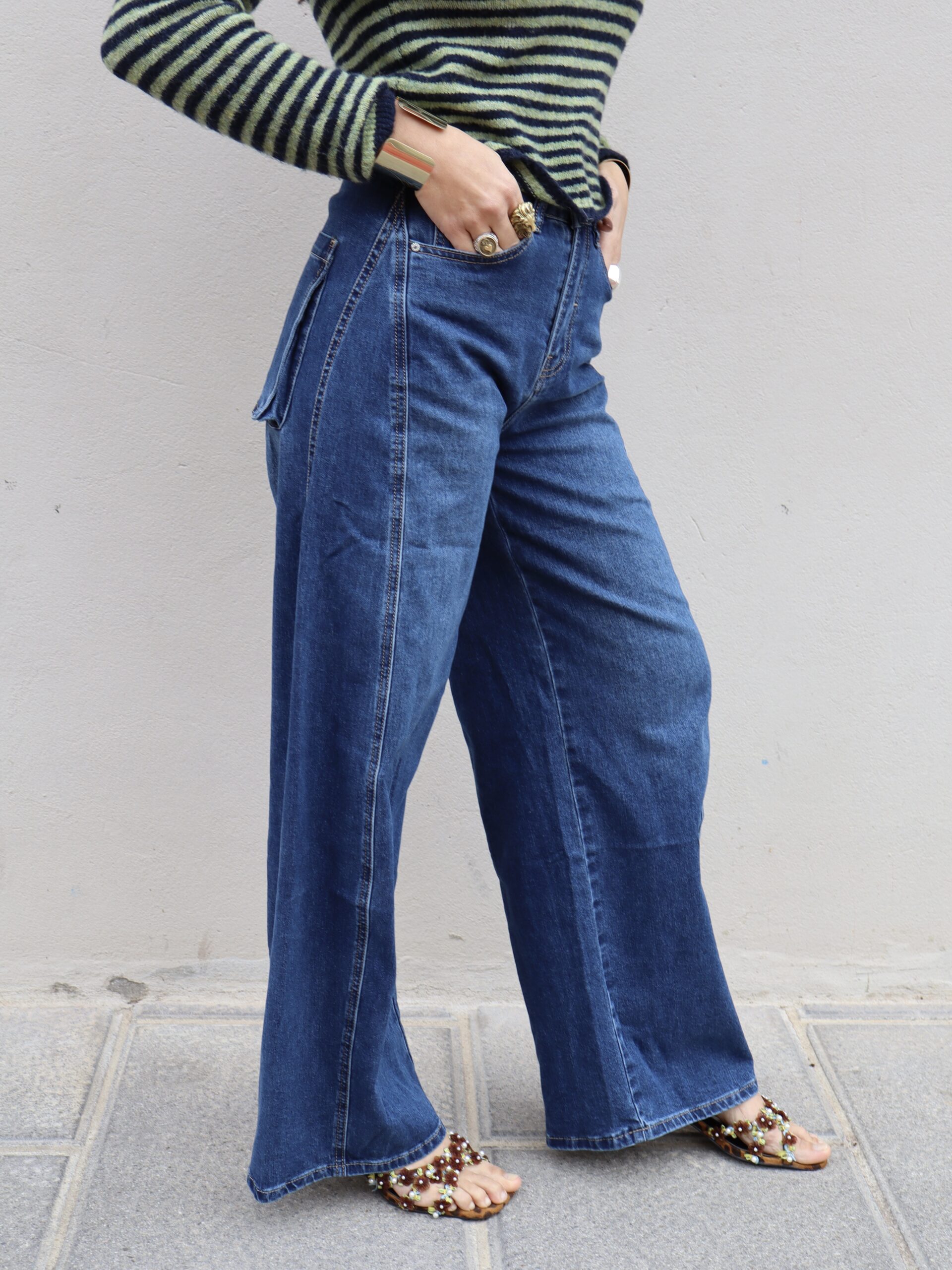 Jeans gamba a barile in denim elasticizzato con motivo laterale.