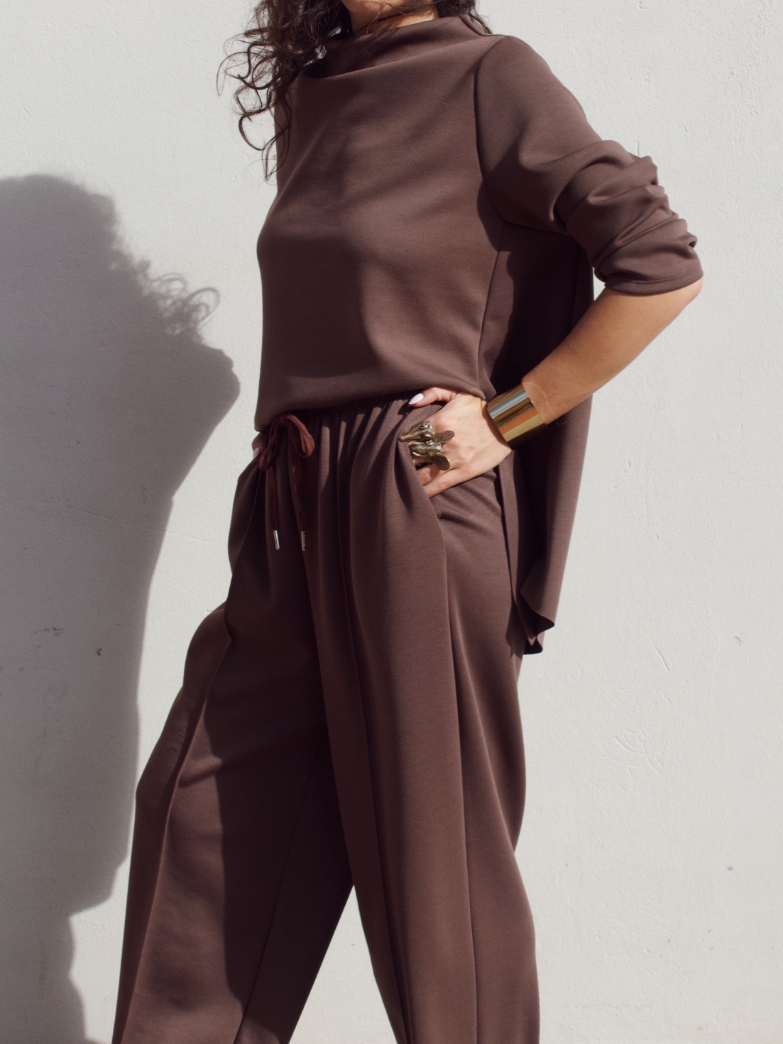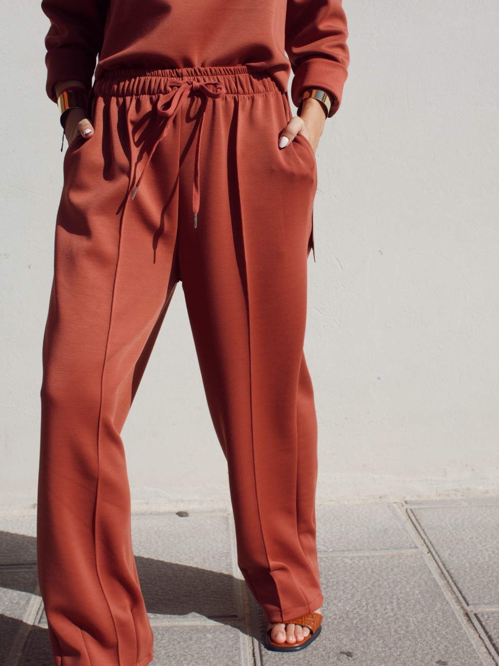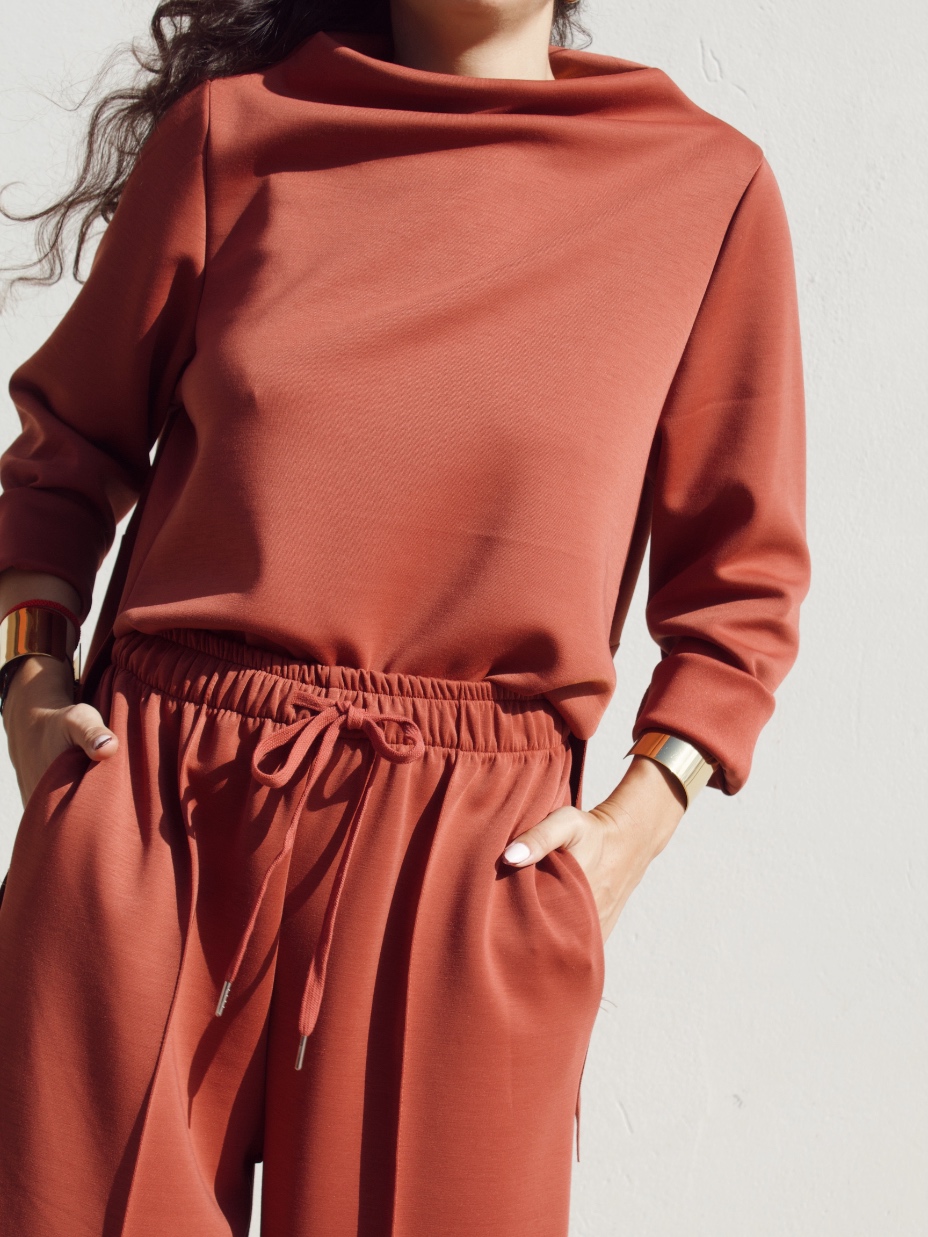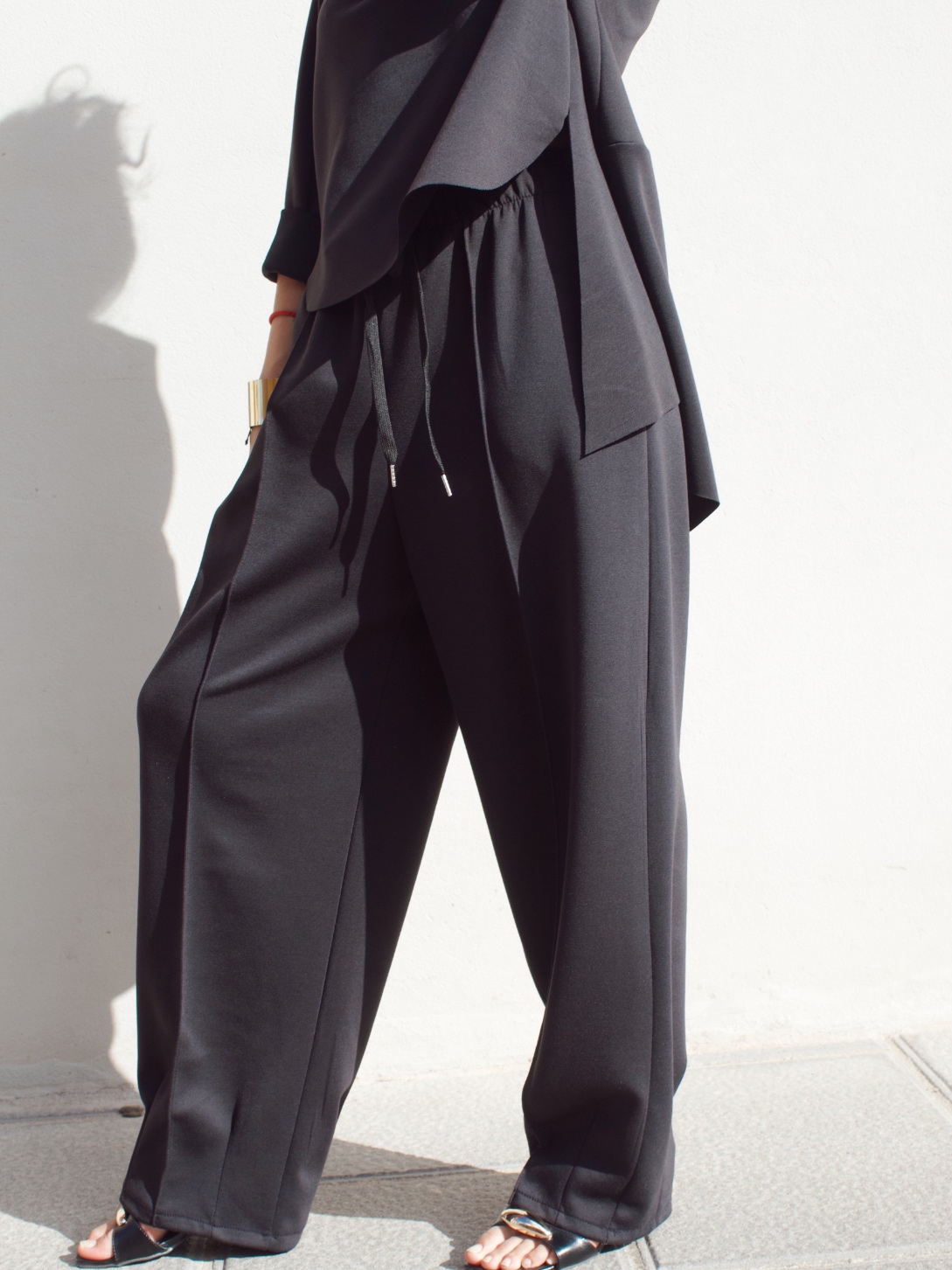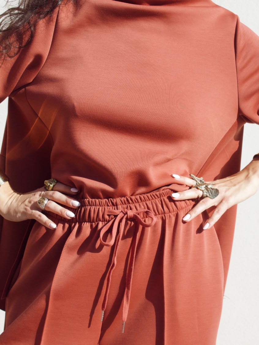 Pantalone effetto tuta in misto viscosa con coulisse in vita regolabile e gamba leggermente a palloncino. È taglia unica e veste fino ad una 46/48.