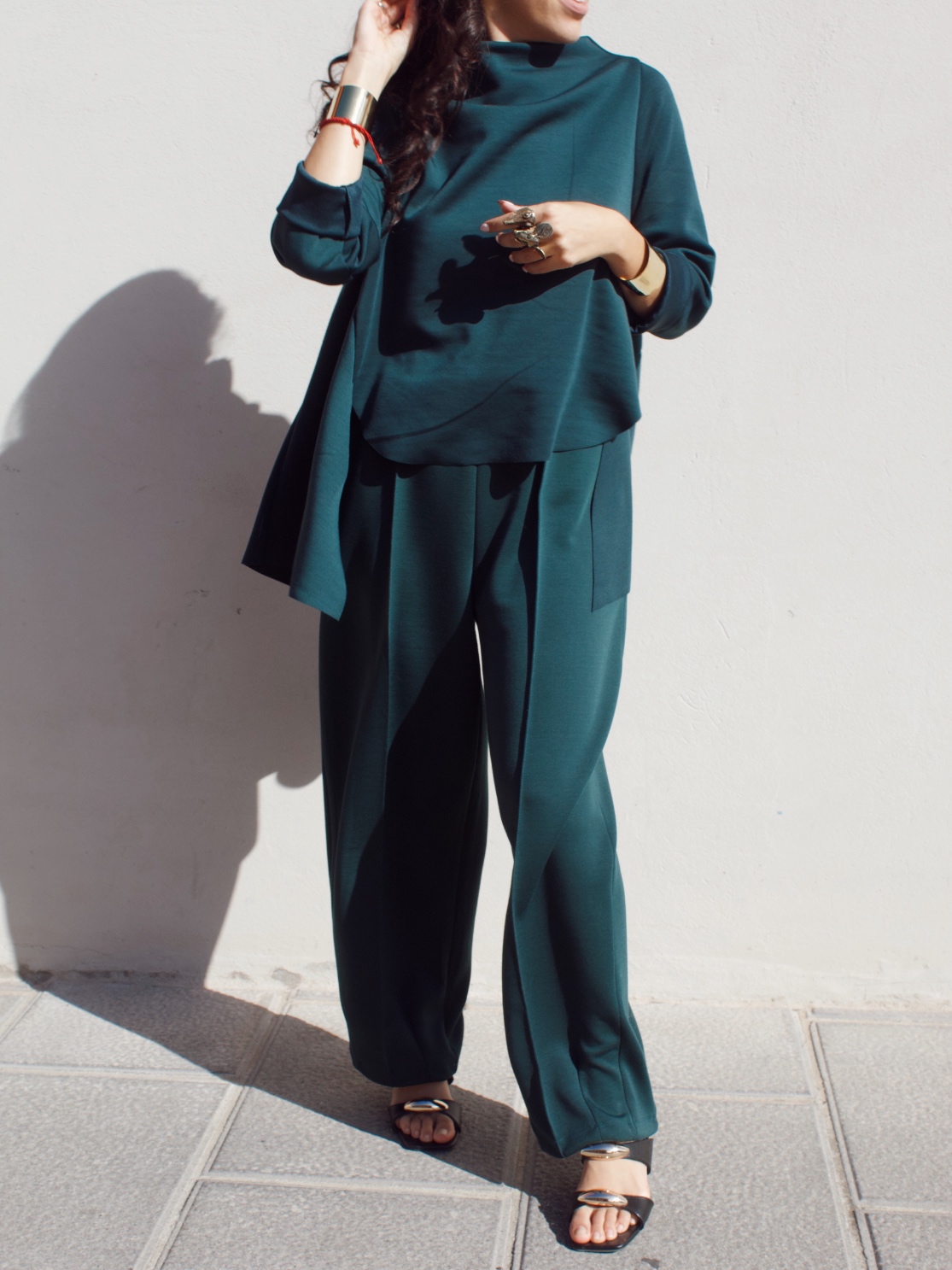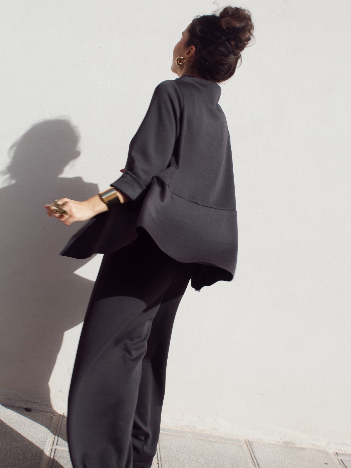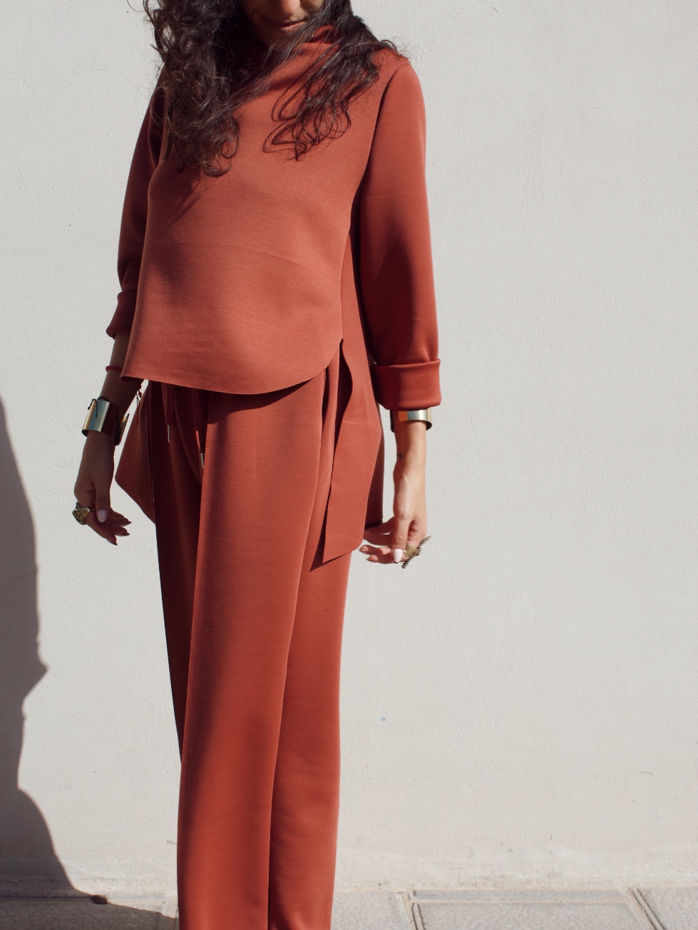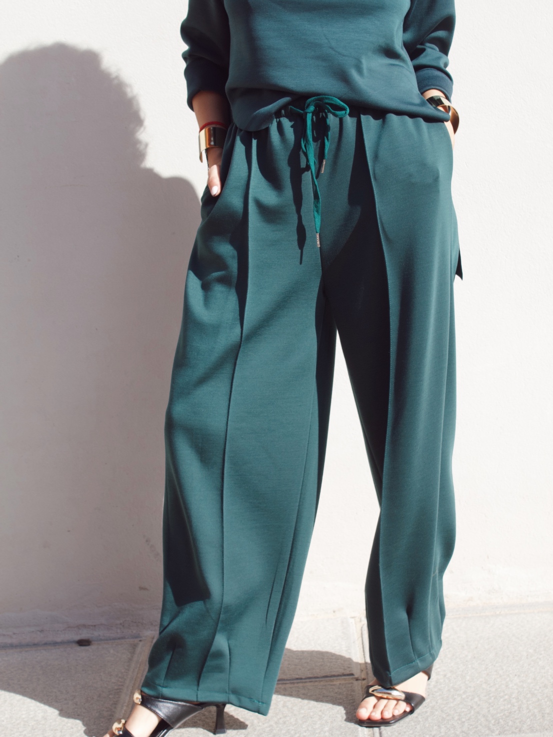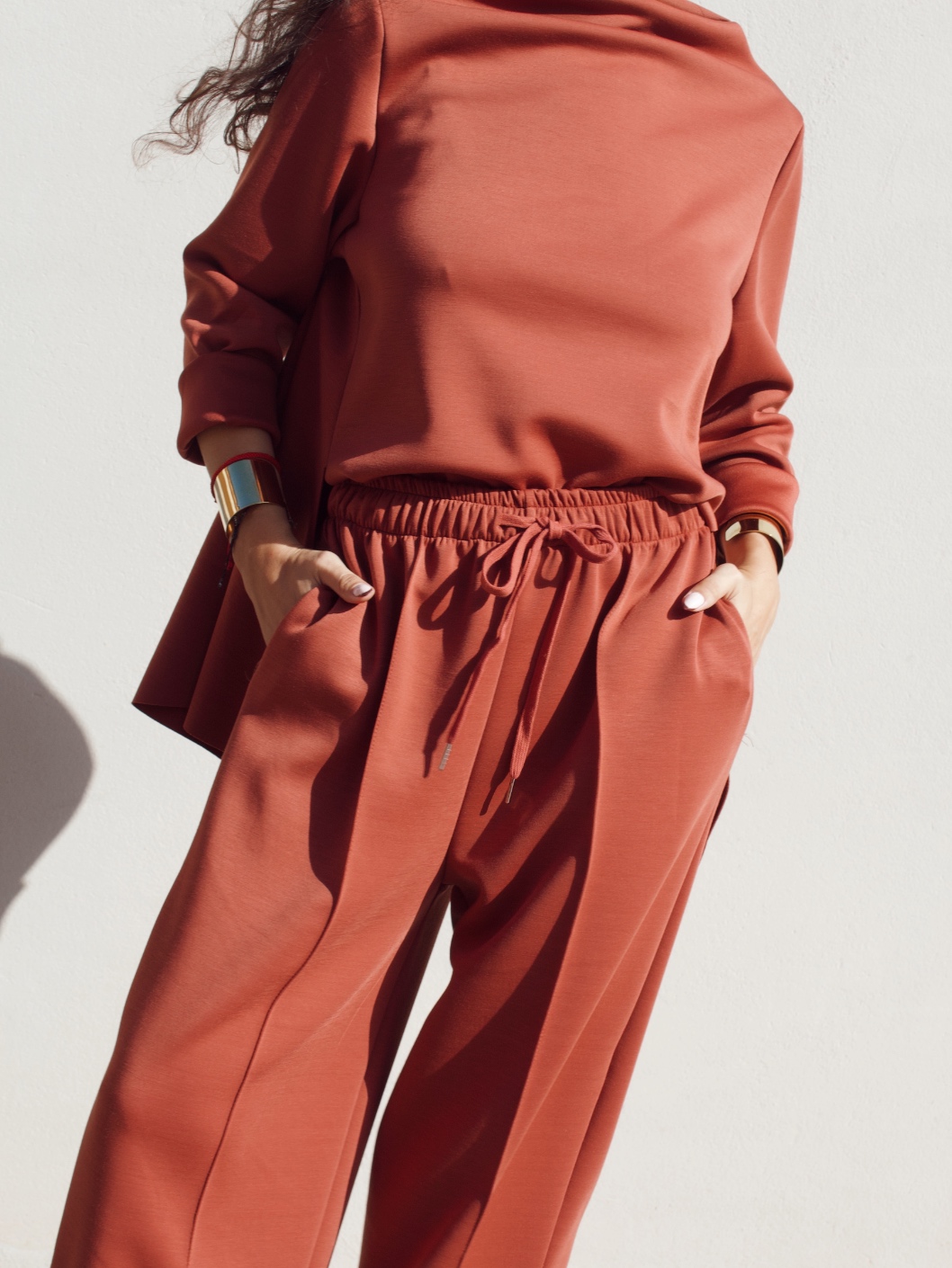 Pantalone effetto tuta in misto viscosa con coulisse in vita regolabile e gamba leggermente a palloncino. È taglia unica e veste fino ad una 46/48.